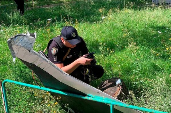 Вибухотехніки поліції працюють на місці падіння. Місце падіння тимчасово огородили для слідчих дій. Фахівці документують подію та вилучають рештки.